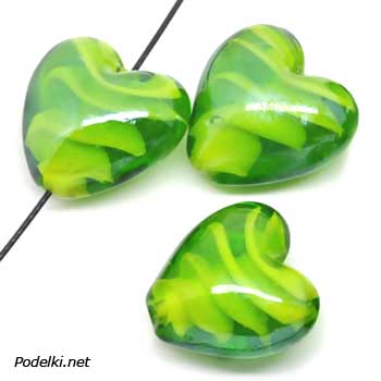 Стеклянная бусина Сердце 0001982 зеленое с желтым прозрачное 25x25x13 мм