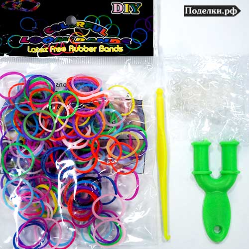 Упаковка разноцветных резиночек, рогатка, крючок, закрепочки