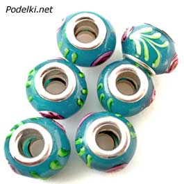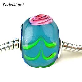 Стеклянная бусина Пандора Цветок 0005103 бирюзовый с розовым и зеленым 14x10 мм