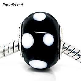 Стеклянная бусина Пандора 0005123 черный в белый горошек 14x10 мм