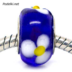Стеклянная бусина Пандора Цветок 0005166 темно-синий прозрачный с белым 14x10 мм