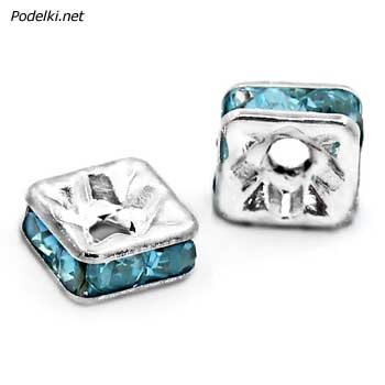 Рондель Квадрат 0006028 серебряный цвет с голубыми стразами 6x6x3 мм