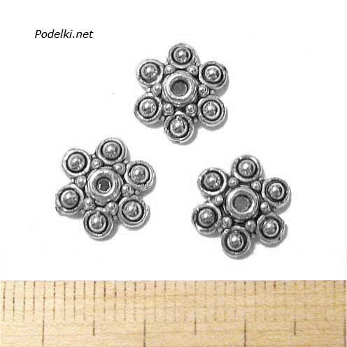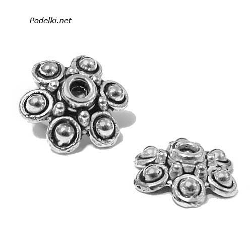 Крепежная шапочка литая Цветок шестилистный с шариками 0006308 серебряный цвет 10x4 мм