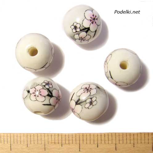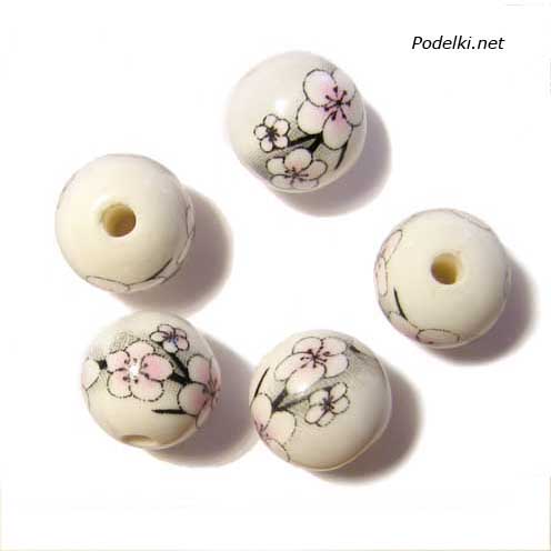 Керамическая бусина белая ветка сакуры 0007001 шарик 9 мм