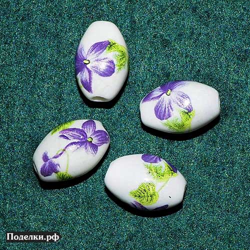 Керамическая бусина белая с сиреневыми цветами 0007040 бочонок 16x12 мм