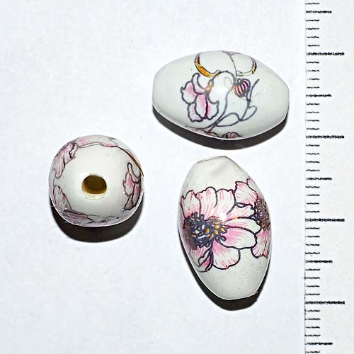 Керамическая бусина белая с розово-серыми цветами 0007045 бочонок 17x13 мм
