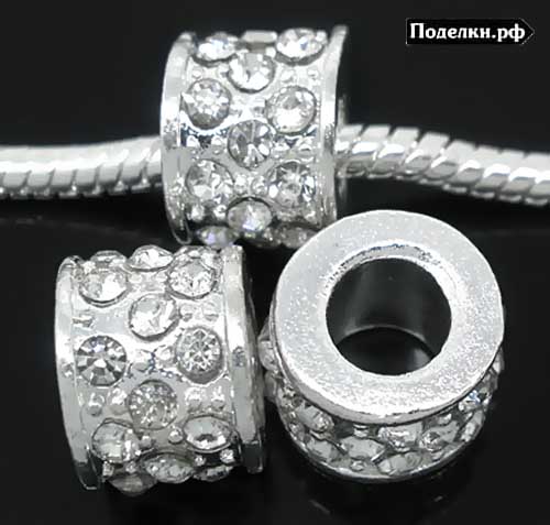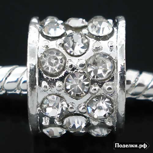 Металлическая бусина Пандора Цилиндр 0007752 серебряный цвет с прозрачными стразами 11x9 мм