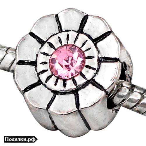 Металлическая бусина Пандора Цветок боковой 0007768 серебряный цвет с розовыми стразами 12x8 мм