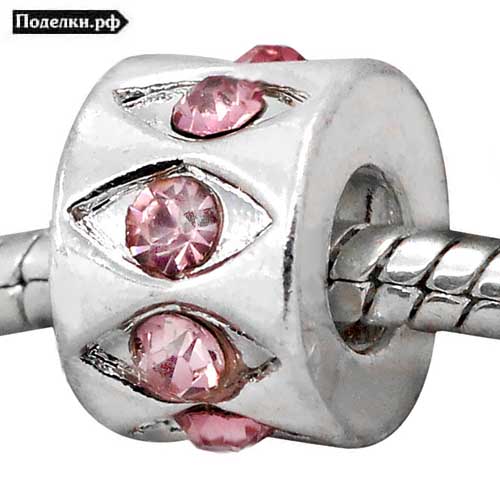 Металлическая бусина Пандора с глазами 0007770 серебряный цвет с розовыми стразами 10x7 мм