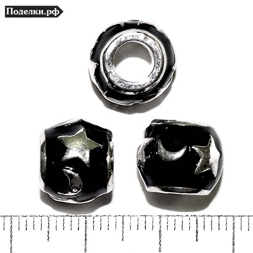 Металлическая бусина Пандора Бочонок звезда и месяц 0009203 серебряный цвет с черной эмалью 11x10 мм