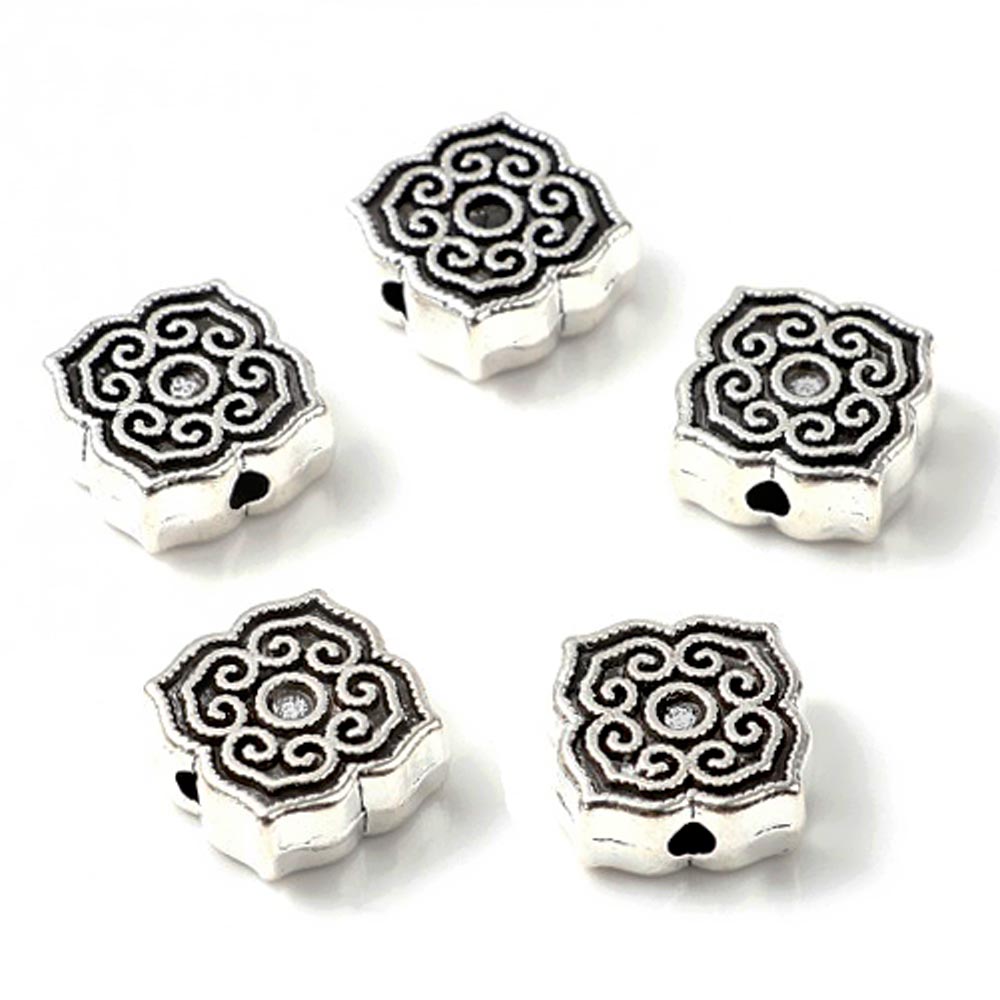 Металлическая бусина Цветок узорный четырехлистный 0011250 серебряный цвет 11x11х5 мм