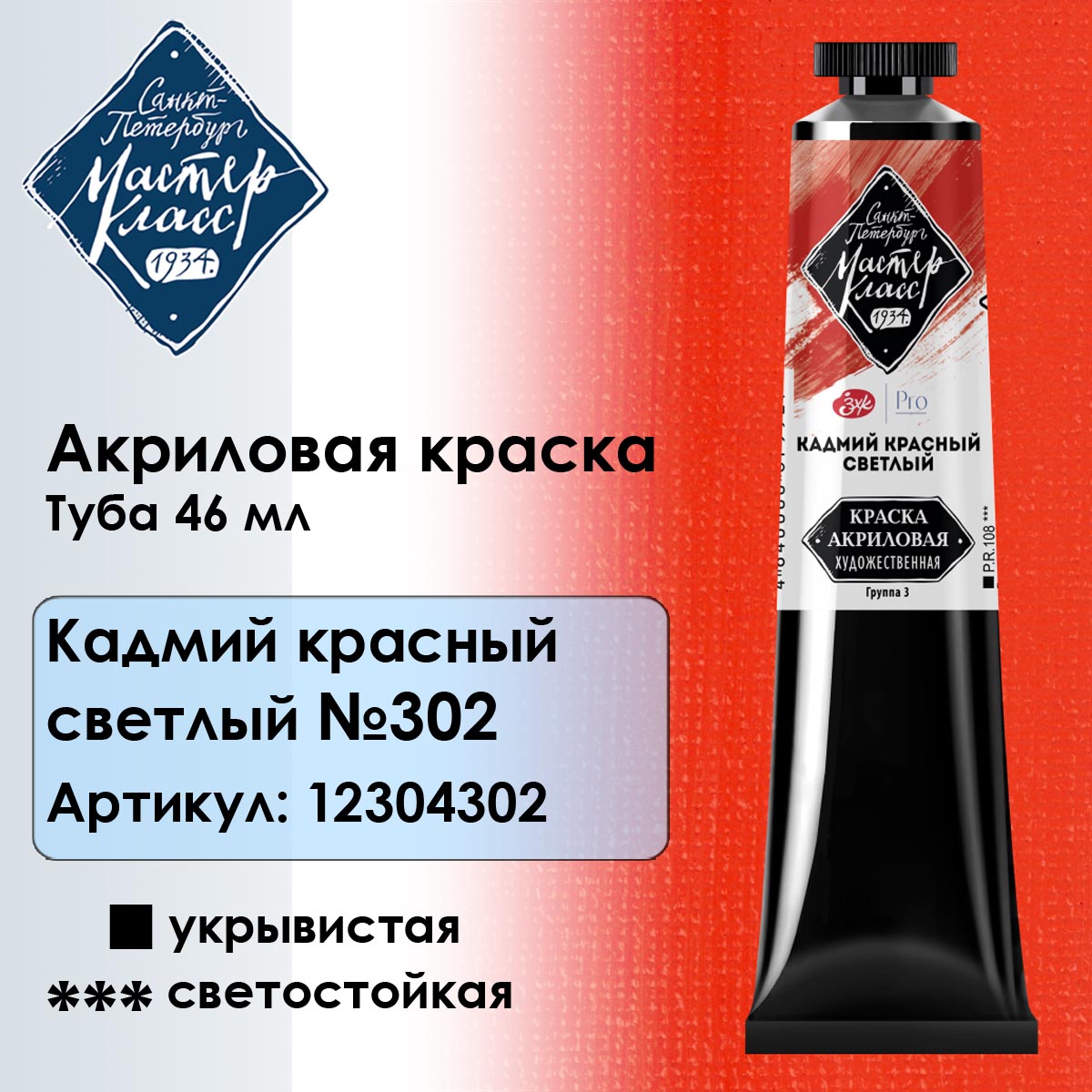 Укрывистая светостойкая краска. Состав: акриловая дисперсия, пигмент, наполнитель, вода, добавки. Художественные акриловые краски «Мастер-Класс» разработаны с учетом требований профессиональных художников. Сбалансированные рецептуры объединяют в себе традиции производства и инновационные разработки. В палитре представлено широкое разнообразие пигментов, в том числе ценные для живописи кадмии и кобальты. Благодаря высокой концентрации пигмента и оптимальному содержанию наполнителей краски сохраняют интенсивность и глубину цвета после высыхания. 94% цветов в ассортименте имеют высочайший показатель светостойкости ***. 60% красок серии составляют монопигментные цвета, которые позволяют получить множество чистых оттенков в смесях. Профессиональный акрил «Мастер-Класс» обладает пастозной консистенцией, позволяющей создавать фактурные мазки. Для творческой свободы художника время высыхания акрила увеличено до 3 часов. После высыхания акрил «Мастер-Класс» приобретает благородный сатиновый блеск.