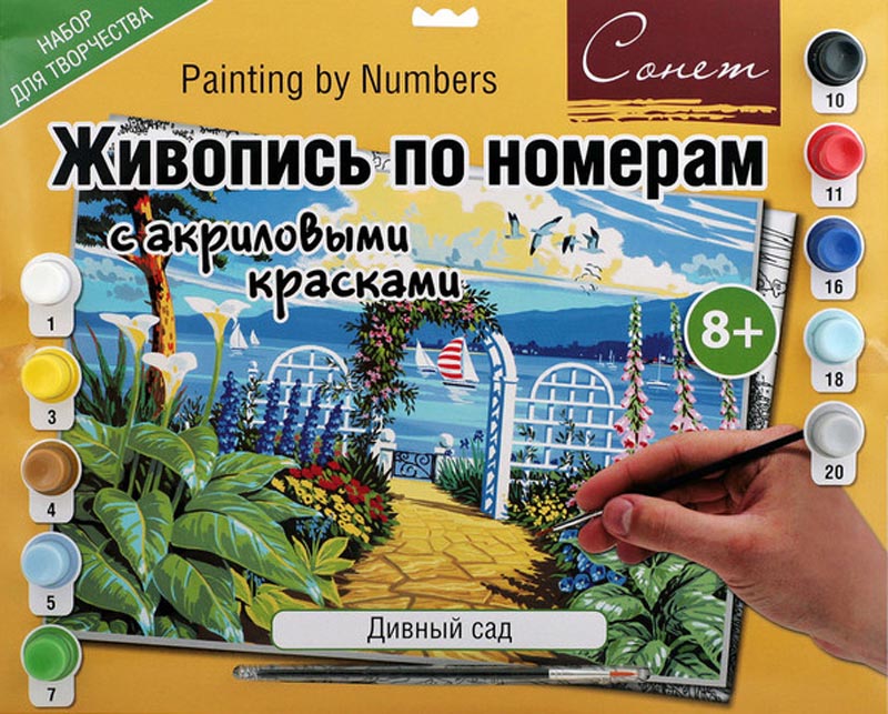 1 грунтованный картон с разметкой для рисунка, 10 акриловых красок, кисточка