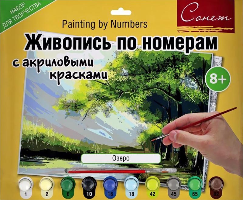 1 грунтованный картон с разметкой для рисунка, 10 акриловых красок, кисточка