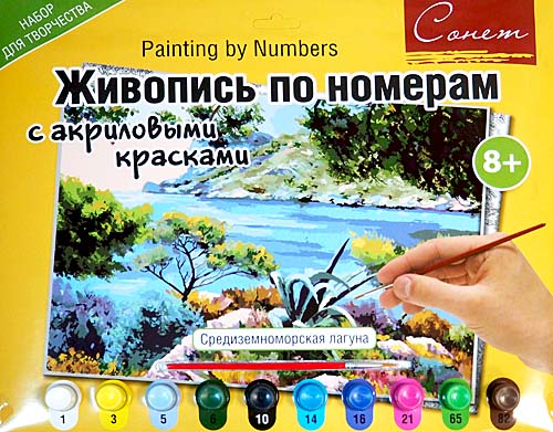 1 грунтованный картон с разметкой для рисунка, 10 акриловых красок, кисточка