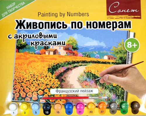 1 грунтованный картон с разметкой для рисунка, 10 акриловых красок, кисточка