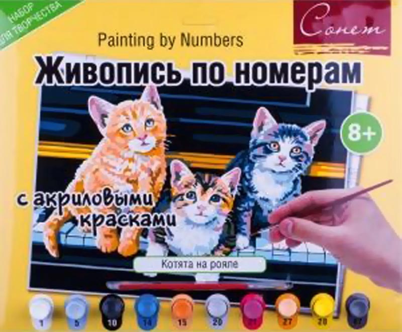 1 грунтованный картон с разметкой для рисунка, 10 акриловых красок, кисточка