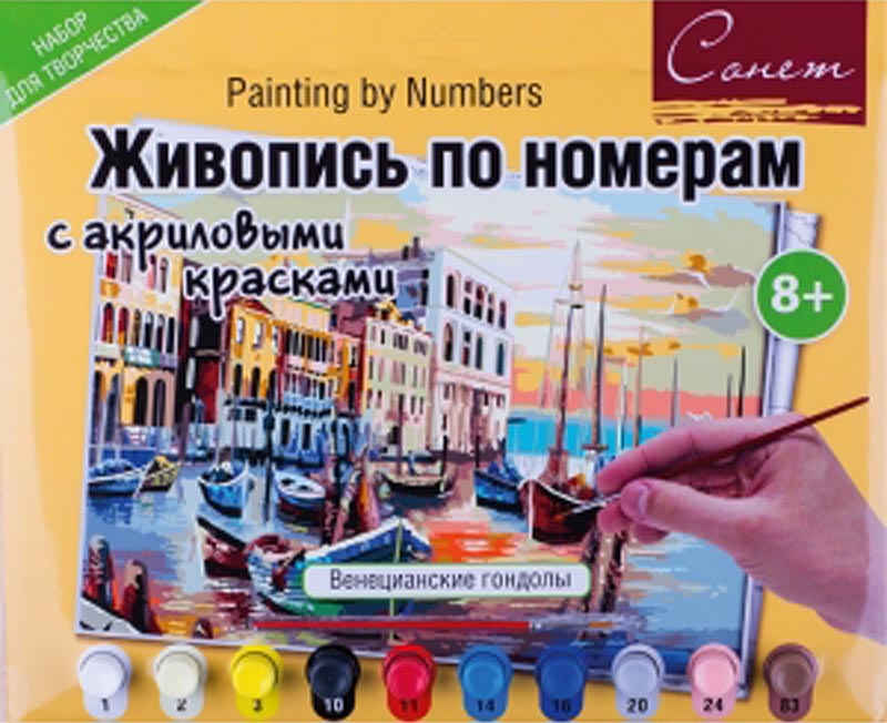 1 грунтованный картон с разметкой для рисунка, 10 акриловых красок, кисточка
