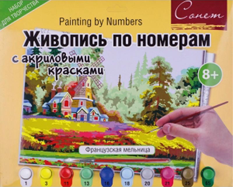1 грунтованный картон с разметкой для рисунка, 10 акриловых красок, кисточка