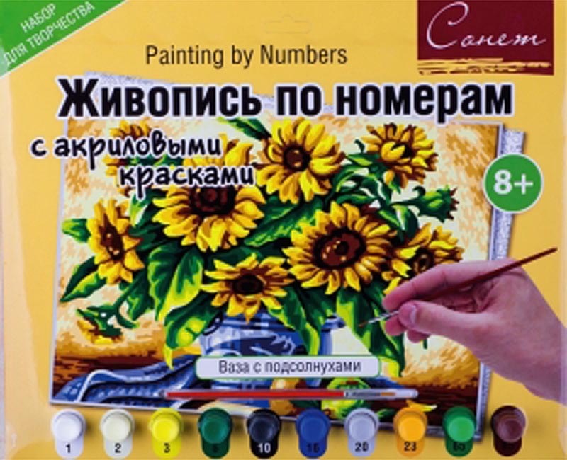 1 грунтованный картон с разметкой для рисунка, 10 акриловых красок, кисточка