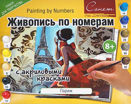1 грунтованный картон с разметкой для рисунка, 10 акриловых красок, кисточка