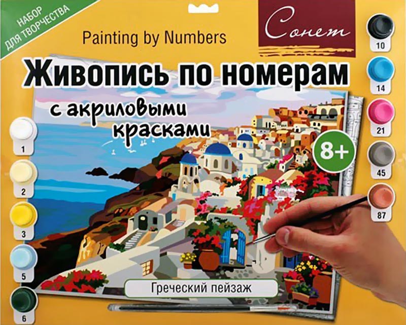 1 грунтованный картон с разметкой для рисунка, 10 акриловых красок, кисточка