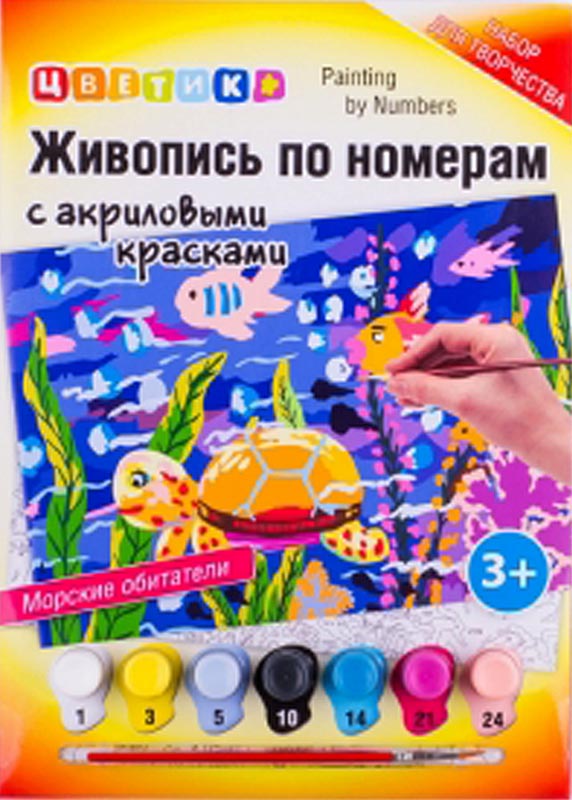 1 грунтованный картон с разметкой для рисунка, 7 акриловых красок, кисточка
