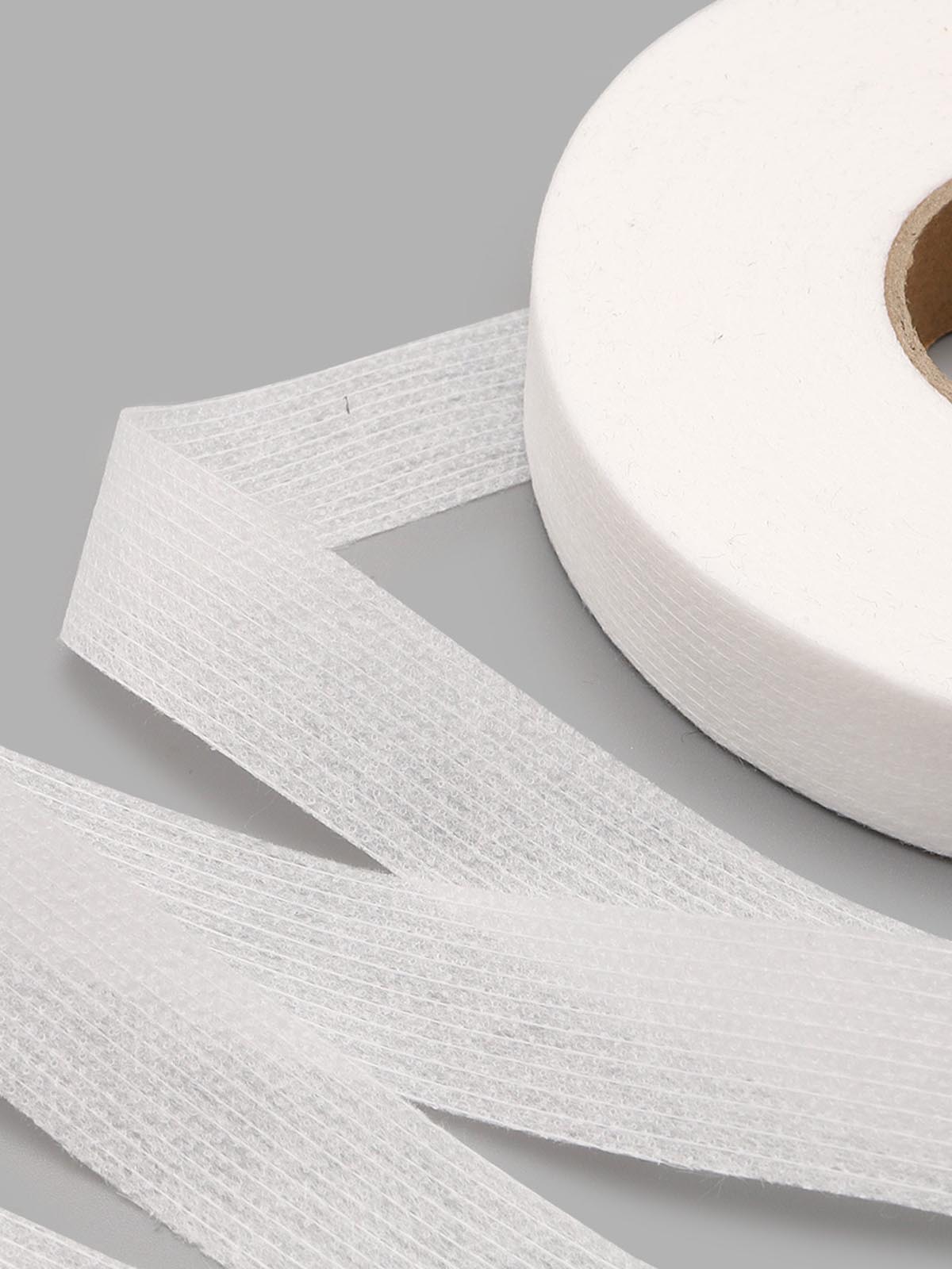 Нитепрошивная лента по долевой изготовлена на основе синтетического нетканого материала с односторонним клеевым слоем. Клей нанесен на поверхность точечно, чтобы не оставить следа даже на самых тонких тканях.