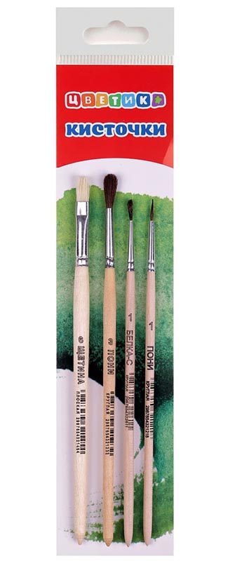4 кисти: щетина плоская №6, белка круглая №1, пони круглая №1, №3