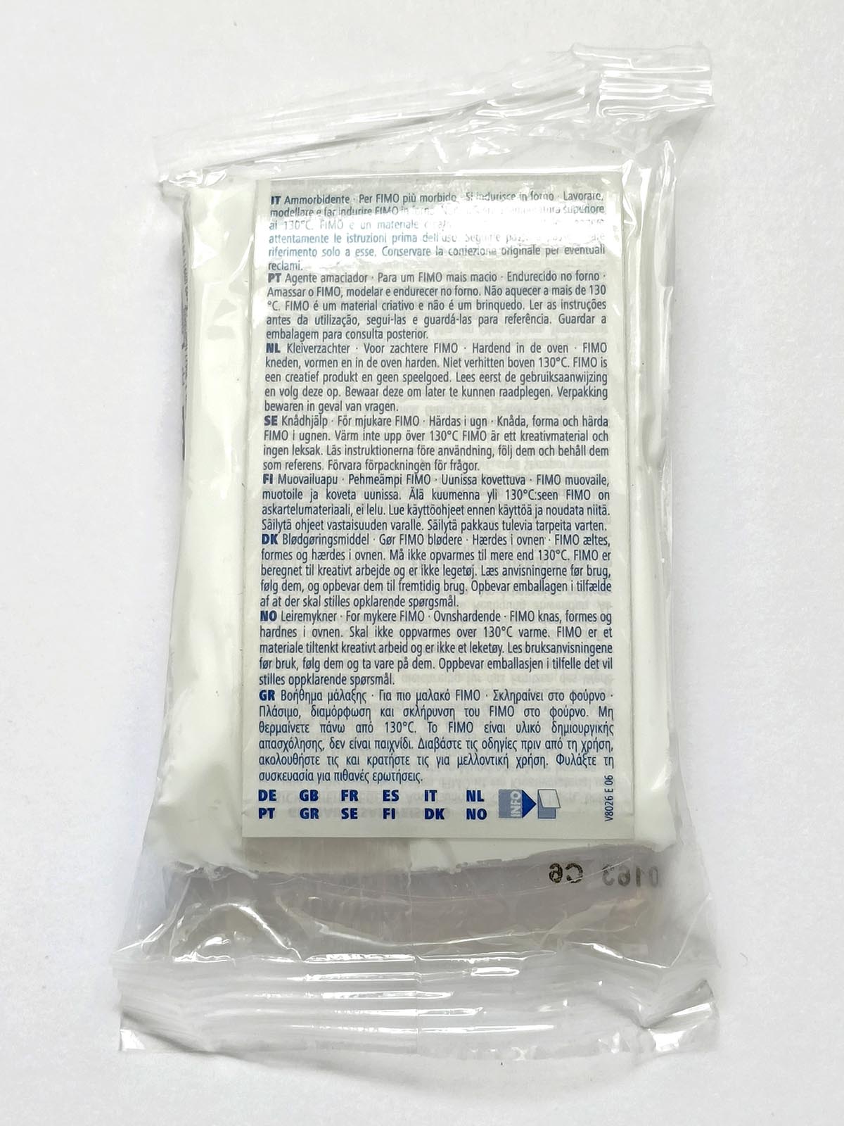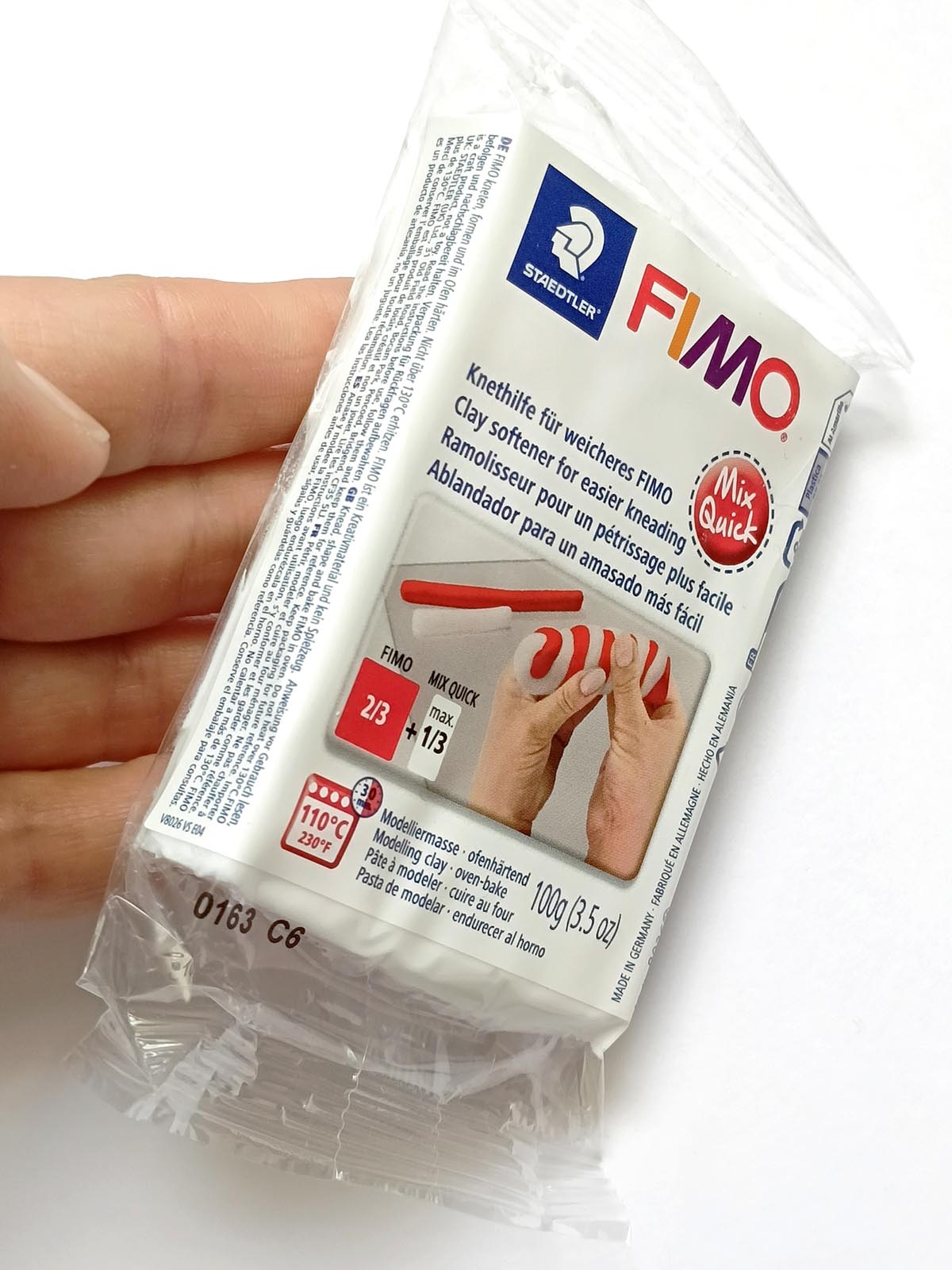 Если пластика кажется слишком твердой для вас, либо потеряла свою мягкость после неправильного хранения открытого брикета, то не все потеряно: с помощью Fimo Mix Quick вы сможете вернуть пластике Fimo прежние свойства! Размягчитель для пластики добавляется в FIMO для увеличения мягкости и делает структуру застаревшей пластики более пластичной и однородной. Не изменяет цвет полимерной глины, но возвращает ее первоначальные свойства, позволяет сэкономить – не выбрасывать старую пластику. Одной пачки FIMO Mix Quick хватает надолго, потому что размягчитель очень эффективен .Полимерная глина будет мягче, а вымешивание займет меньше времени.Также пригоден для облегчения работы с экструдером. FIMO Mix Quick не изменяет цвет размягчаемого пластика и подходит для полимерной глины любого производителя. Такой размягчитель можно использовать не только для трудно размягчающейся глины, но и глины засохшей, которая, как Вы думали, более непригодна для использования. Вес размягчителя составляет 100 граммов. Его консистенция на ощупь напоминает маслянистый пластик и подходит для всех видов полимерной глины. Для размягчения затвердевшего пластика необходимо вмешать в пластик небольшое количество FIMO Mix Quick (2/3 FIMO к 1/3 размягчителя). Размять вместе пластик и FIMO Mix Quick, пока не получится однородный упругий и годный к работе материал.