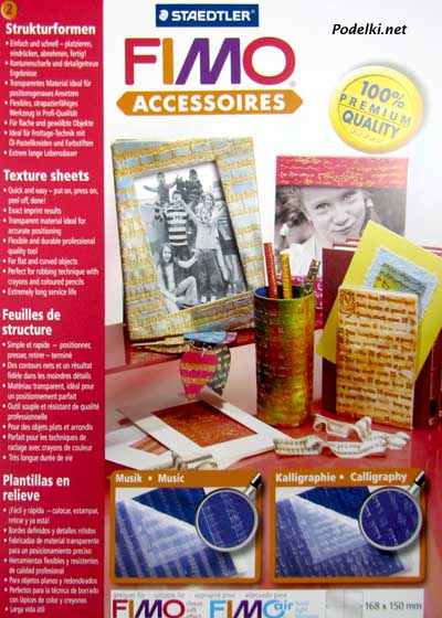 Текстурные листы специально разработаны для использования со всеми видами глин FIMO, обеспечивая получение четкого рисунка. Текстурные листы также пригодны для создания узоров на бумаге с помощью мелков, масляной пастели и карандашей. Это гибкое и прочное приспособление профессионального качества c длительным сроком службы. Для упрощения работы следует нанести на текстурный лист воду из распылителя (только для запекаемых глин), присыпку или крахмал. Текстурный лист запекать нельзя!