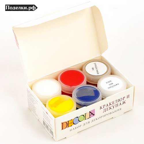 4 акриловые глянцевые краски(красная, синяя, желтая, белая), лак кракелюрный, клей для декупажа