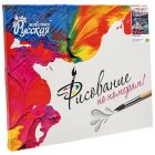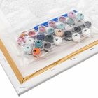 холст на подрамнике, пронумерованные баночки с акриловыми красками, 3 кисти с нейлоновой щетиной разных размеров, лайнер, контрольный лист со схемой, финишный лак