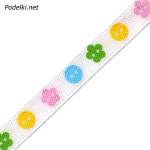 Атласная лента ALP064-B1-075 белая в пуговках и цветочках 6 мм