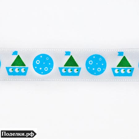 Атласная лента ALP122-G9-001 белая с корабликами 12 мм