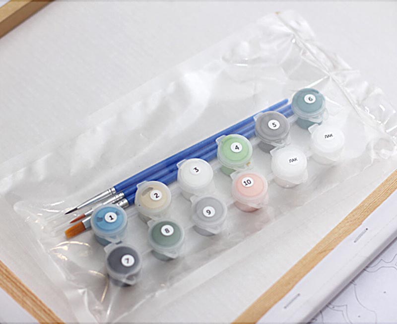 холст на подрамнике, пронумерованные баночки 24 цвета с акриловыми красками, 3 кисти с нейлоновой щетиной разных размеров, лайнер, контрольный лист со схемой, финишный лак