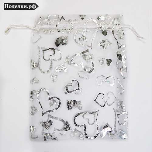 Пакетик из органзы DD21-36 белый с серебристыми сердечками 13x15 см
