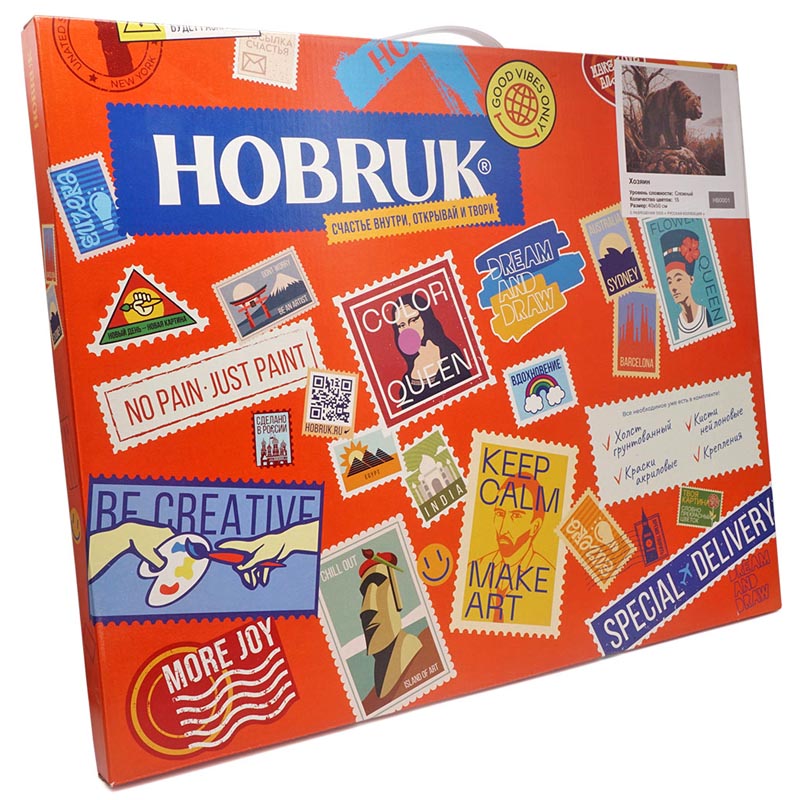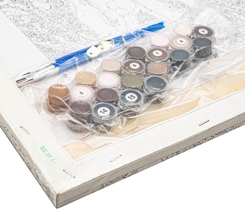холст на подрамнике с разметкой для рисунка, акриловые краски 15 цветов в вакууме, 3 кисточки, контрольный лист, крепежные элементы, 2 баночки лака