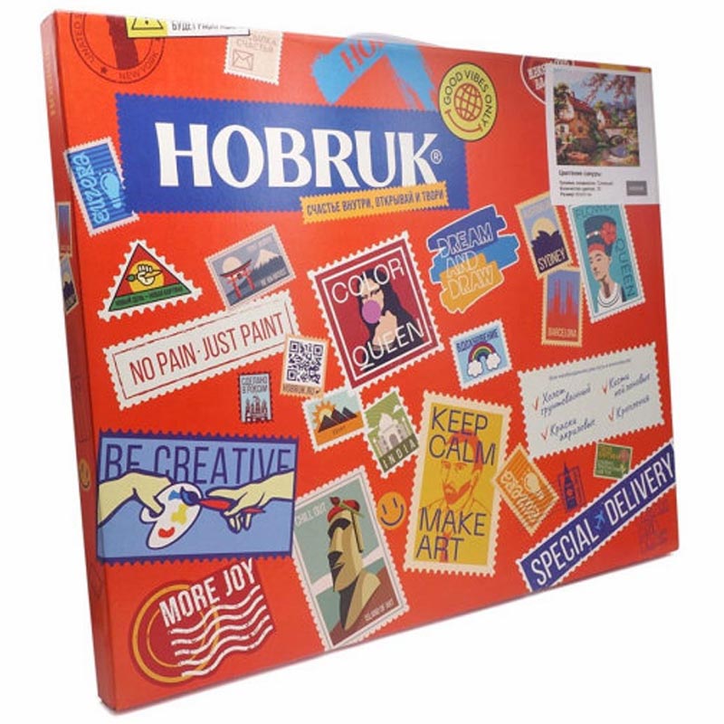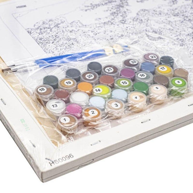 холст на подрамнике с разметкой для рисунка, акриловые краски в вакууме, 3 кисточки, контрольный лист, крепежные элементы, 2 баночки лака