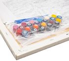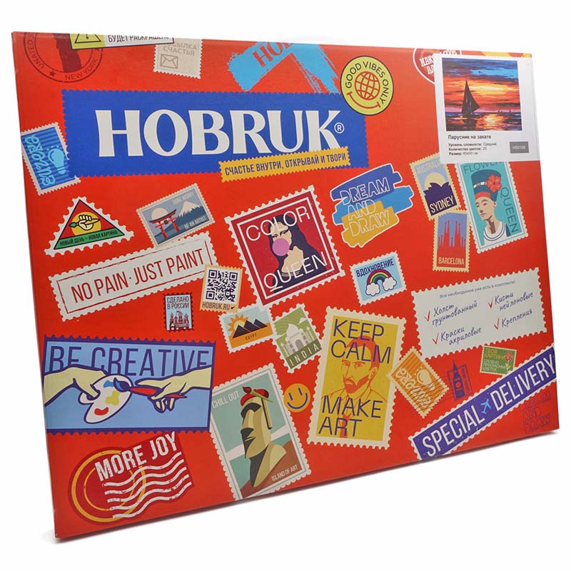 холст на подрамнике с разметкой для рисунка, акриловые краски в вакууме, 3 кисточки, контрольный лист, крепежные элементы, 2 баночки лака