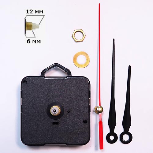 Комплект: бесшумный механизм (360 имп/мин, шток 12/6 мм), 3 стрелки (минутная 85 мм от оси, часовая 62 мм), гайка с шайбой