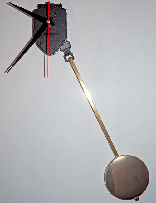 Комплект: механизм с маятником шток 12 мм (толщина циферблата до 4 мм), стрелки металлические (часовая 70 мм от оси, минутная 95 мм, секундная), гайка с шайбой и прокладкой, маятник 350х88 мм