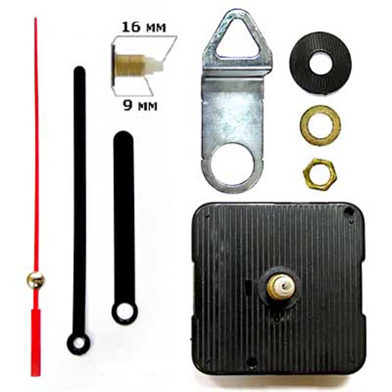 Комплект: бесшумный механизм (360 имп/мин, шток 16/9 мм), 3 стрелки (минутная 95 мм от оси, часовая 60 мм), гайка с шайбой и прокладкой, металлическая петля