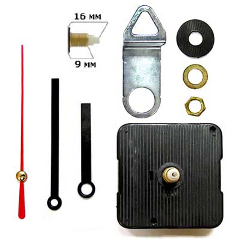Комплект: бесшумный механизм (360 имп/мин, шток 16/9 мм), 3 стрелки (минутная 63 мм от оси, часовая 43 мм), гайка с шайбой и прокладкой, металлическая петля
