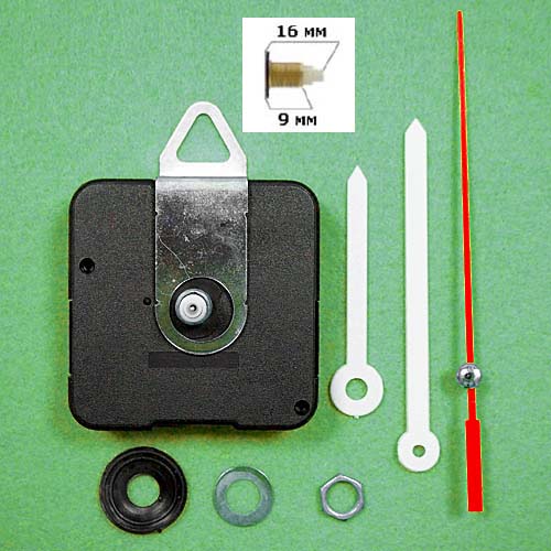 Комплект: бесшумный механизм (360 имп/мин, шток 16/9 мм), 3 стрелки (пластиковые минутная 77 мм от оси, часовая 51 мм), гайка с шайбой и прокладкой, металлическая петля