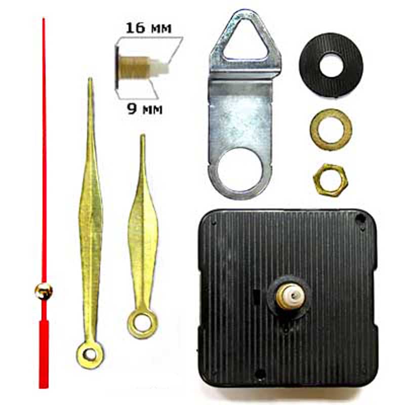 Комплект: бесшумный механизм (360 имп/мин, шток 16/9 мм), 3 стрелки (минутная 93 мм от оси, часовая 60 мм), гайка с шайбой и прокладкой, металлическая петля