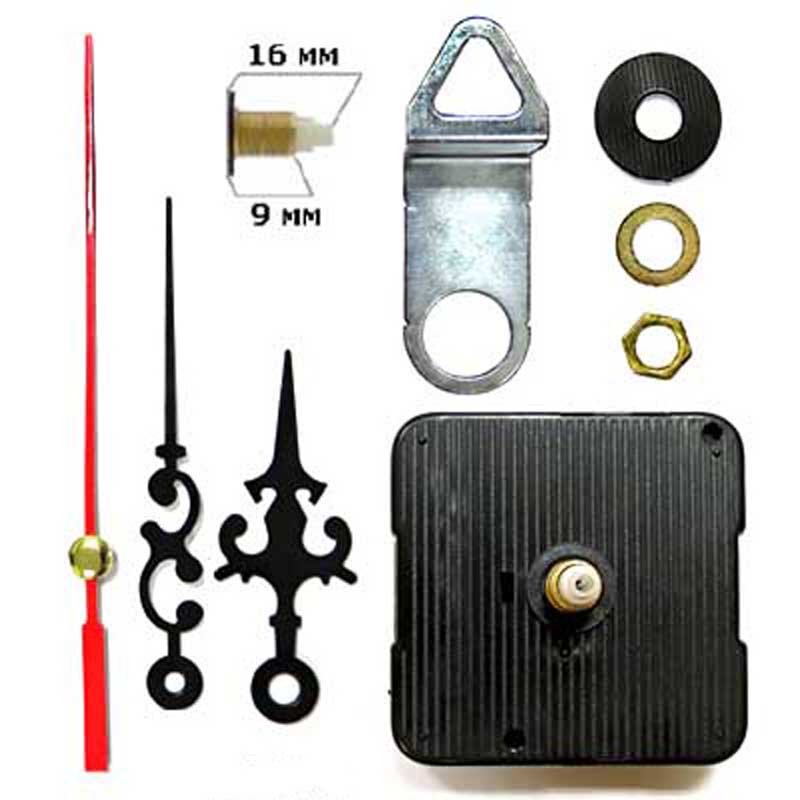 Комплект: бесшумный механизм (360 имп/мин, шток 16/9 мм), 3 стрелки (минутная 88 мм от оси, часовая 58 мм), гайка с шайбой и прокладкой, металлическая петля