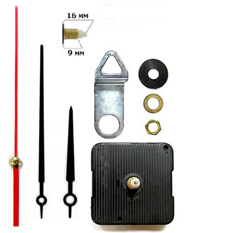 Комплект: бесшумный механизм (360 имп/мин, шток 18/12 мм), 3 стрелки (минутная 90 мм от оси, часовая 65 мм), гайка с шайбой и прокладкой, металлическая петля