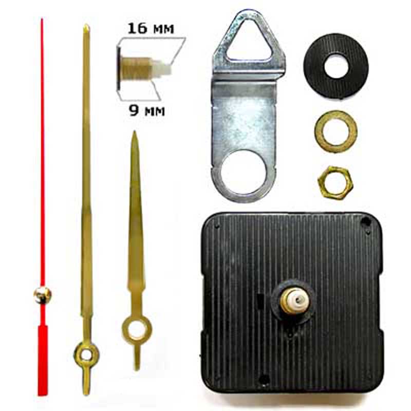 Комплект: бесшумный механизм (360 имп/мин, шток 16/9 мм), 3 стрелки (минутная 108 мм от оси, часовая 65 мм), гайка с шайбой и прокладкой, металлическая петля