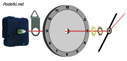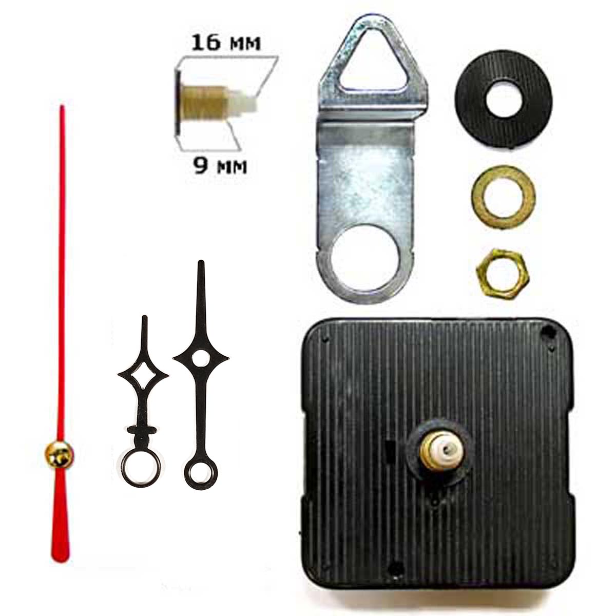 Комплект: бесшумный механизм (360 имп/мин, шток 16/9 мм), 3 стрелки (минутная 37 мм от оси, часовая 21 мм), гайка с шайбой и прокладкой, металлическая петля